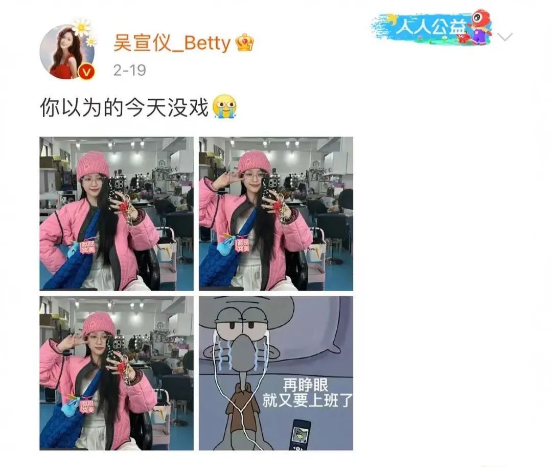 大年头十环球纷繁复工时,吴宣仪发博称“你认为的今天没戏”,还配了一个抽啼哭噎的色调和“再睁眼就又要上班了”的色调图,仿佛一个遇到折磨的等闲打工东谈主吐槽我方不想上班。