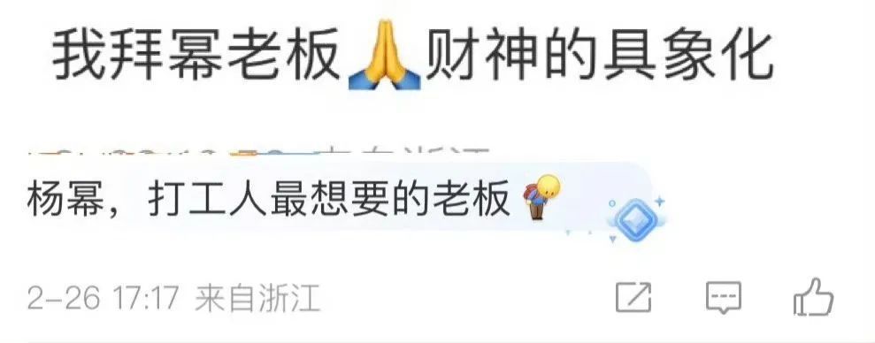 无特有偶,杨幂近期就营销了一个话题——“想要杨幂这样的雇主”。因为有传言称杨幂部下的职工不错开脱使用杨幂代言的通盘商品,被杨幂送各式品牌礼物,给职工发20万的红包。总的来说:即是钱多。于是好多粉丝驱动吹捧拜杨幂即是拜财神爷,但愿有她这样的雇主。